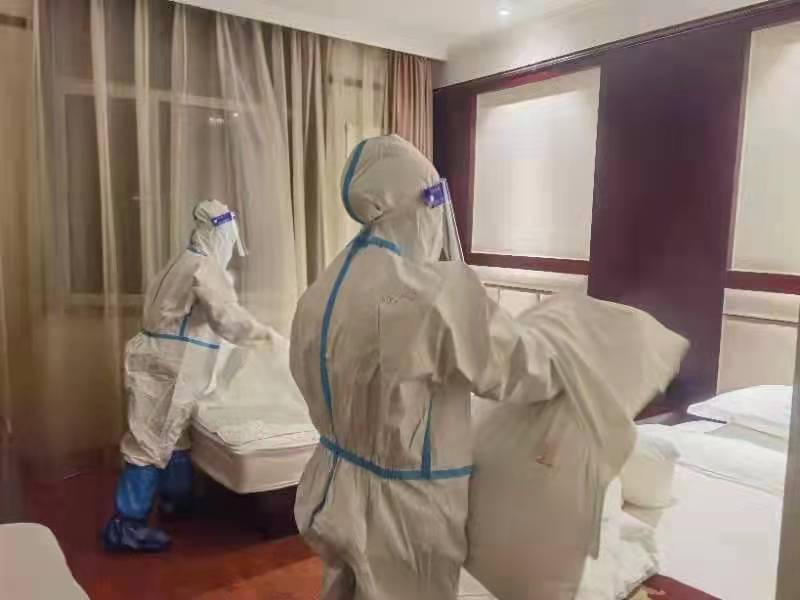 閉環(huán)服務(wù)期間,客房部員工面對疫情不畏懼不退縮,不計(jì)較個人得失,甚至有的同志帶病工作,卻仍然義無反顧堅(jiān)守崗位,累計(jì)閉環(huán)54天。11月10日,入住西樓的84名醫(yī)護(hù)人員臨時通知撤離,由甘肅省人民醫(yī)院緊急抽調(diào)的101名醫(yī)護(hù)人員入住換防。當(dāng)時飯店其他員工都在居家辦公,客房部18位輪休人員第一時間主動請纓,努力說服家人,自主到社區(qū)辦理通行證后趕到飯店,投入緊張的客房和公共區(qū)域衛(wèi)生清掃與消殺工作,直到凌晨2點(diǎn)。在這個特殊的時刻,飯店客房部員工筑起了牢固的防疫堡壘,堅(jiān)守著這個特殊的“戰(zhàn)場”,他們的默默奉獻(xiàn)與守護(hù)也成為了醫(yī)護(hù)人員眼中最可愛的“逆行者”。