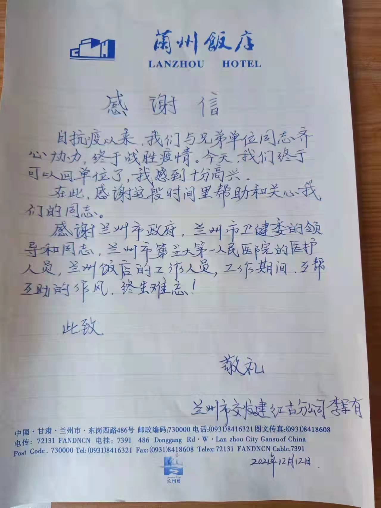 抗擊新冠肺炎疫情,事關(guān)大局,關(guān)乎每個人的生命安全與身體健康。疫情發(fā)生后,飯店領(lǐng)導(dǎo)和所有黨員干部主動擔(dān)當(dāng)、敢于作為,堅(jiān)持工作在一線,體現(xiàn)了飯店的社會責(zé)任,為疫情防控積極奉獻(xiàn)力量。隔離結(jié)束后,醫(yī)護(hù)人員們通過感謝信、微信和電話等方式,由衷感謝蘭州飯店服務(wù)人員的暖心陪伴和貼心服務(wù)。
