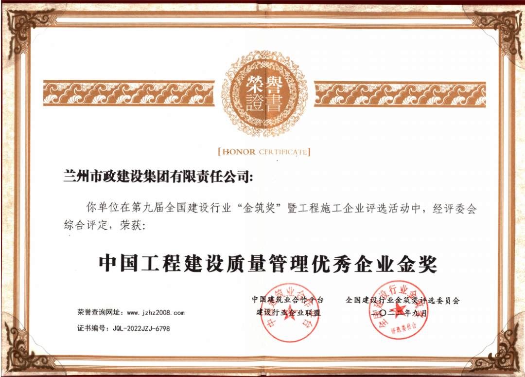 “金筑獎”是由中國建筑業(yè)企業(yè)合作平臺、全國建筑業(yè)金筑獎評選委員會聯(lián)合頒發(fā)的年度獎項,素有中國建設(shè)行業(yè)的“奧斯卡”之稱。此次“金筑獎”暨工程施工企業(yè)評選中,公司獲得“中國工程建設(shè)質(zhì)量管理優(yōu)秀企業(yè)金獎”。據(jù)統(tǒng)計,公司近年來已獲得上百項各層級的質(zhì)量獎項,其中全國優(yōu)質(zhì)工程獎1項、“魯班獎”3項,中國市政示范工程“金杯獎”6項。