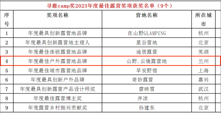 近日,中國(guó)旅游景區(qū)協(xié)會(huì)露營(yíng)分會(huì)和中國(guó)車船協(xié)會(huì)房車露營(yíng)分會(huì)指導(dǎo)支持的狐小旅首屆全國(guó)露營(yíng)主理人大會(huì)暨2023“尋鹿CAMP”頒獎(jiǎng)典禮在途居南通開沙島露營(yíng)地舉行。甘肅文旅集團(tuán)旗下石佛溝國(guó)家森林公園山野云境露營(yíng)地榮獲“首屆尋鹿CAMP獎(jiǎng)2023年度最佳戶外露營(yíng)地品牌獎(jiǎng)”獎(jiǎng)項(xiàng)。